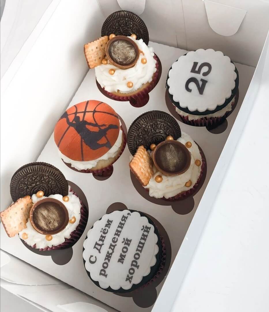 В зависимости от увлечений вашего мужчины мы можем подобрать любой дизайн капкейков - от баскетбола до увлечения машинами, от истории древней Греции до полетов в космос