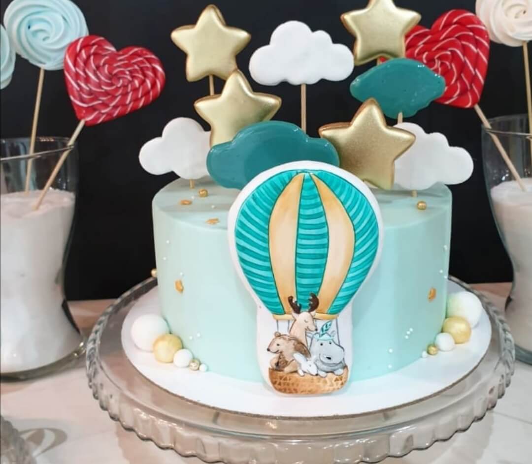 Милые зверята на воздушном шаре украшают небесно-праздничный тортик для ваших малышей